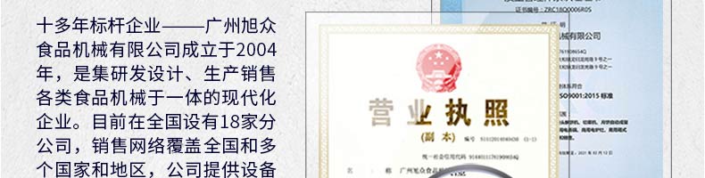廣州旭眾食品機械有限公司是一家集科研開發,生產設計,營銷服務為一體的現代化生產企業。現代化生產車間,精湛制造技術,所產機械歷經市場重重考驗,不斷贏得海內外客戶的贊譽。