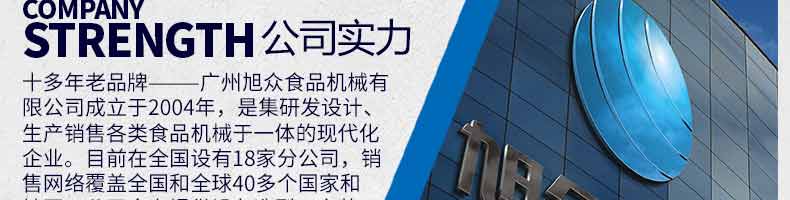 廣州旭眾食品機(jī)械有限公司是一家集科研開發(fā),生產(chǎn)設(shè)計(jì),營銷服務(wù)為一體的現(xiàn)代化生產(chǎn)企業(yè)。現(xiàn)代化生產(chǎn)車間,精湛制造技術(shù),所產(chǎn)機(jī)械歷經(jīng)市場重重考驗(yàn),不斷贏得海內(nèi)外客戶的贊譽(yù)。