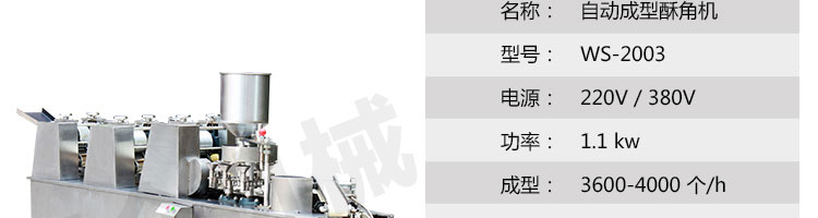 名稱WS-2003 型自動成型酥角機(油餃機) 電源220/380V 功率1.1kw 產量3600-4000個/小時 尺寸外形尺寸3150*500*1300mm 重量450kg 規格 其他