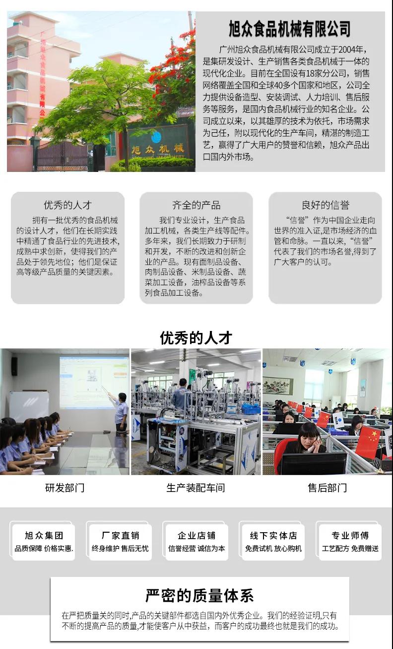 廣州旭眾食品機械有限公司是一家集科研開發,生產設計,營銷服務為一體的現代化生產企業。現代化生產車間,精湛制造技術,所產機械歷經市場重重考驗,不斷贏得海內外客戶的贊譽。